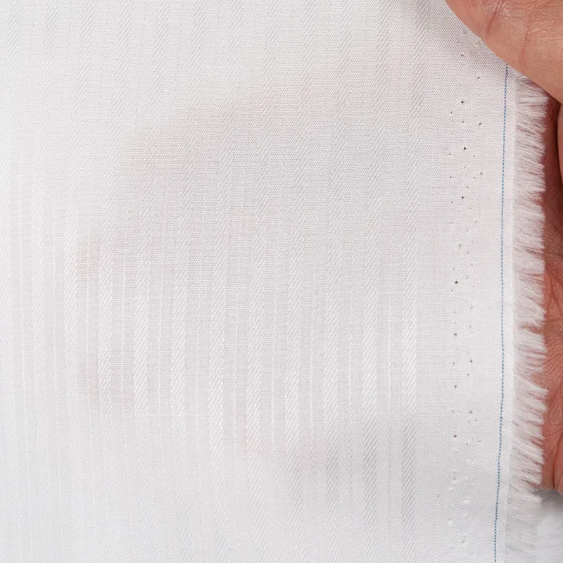 詳細光沢感のあるホワイトのオルタネート・ドビーストライプの綿100%イージーケア素材です。家庭洗濯+軽いアイロンがけですっきり・きっちりと着こなせる忙しいビジネスマンにぴったりの素材です。肌触りも綿100%の風合いを損なわない着心地です。