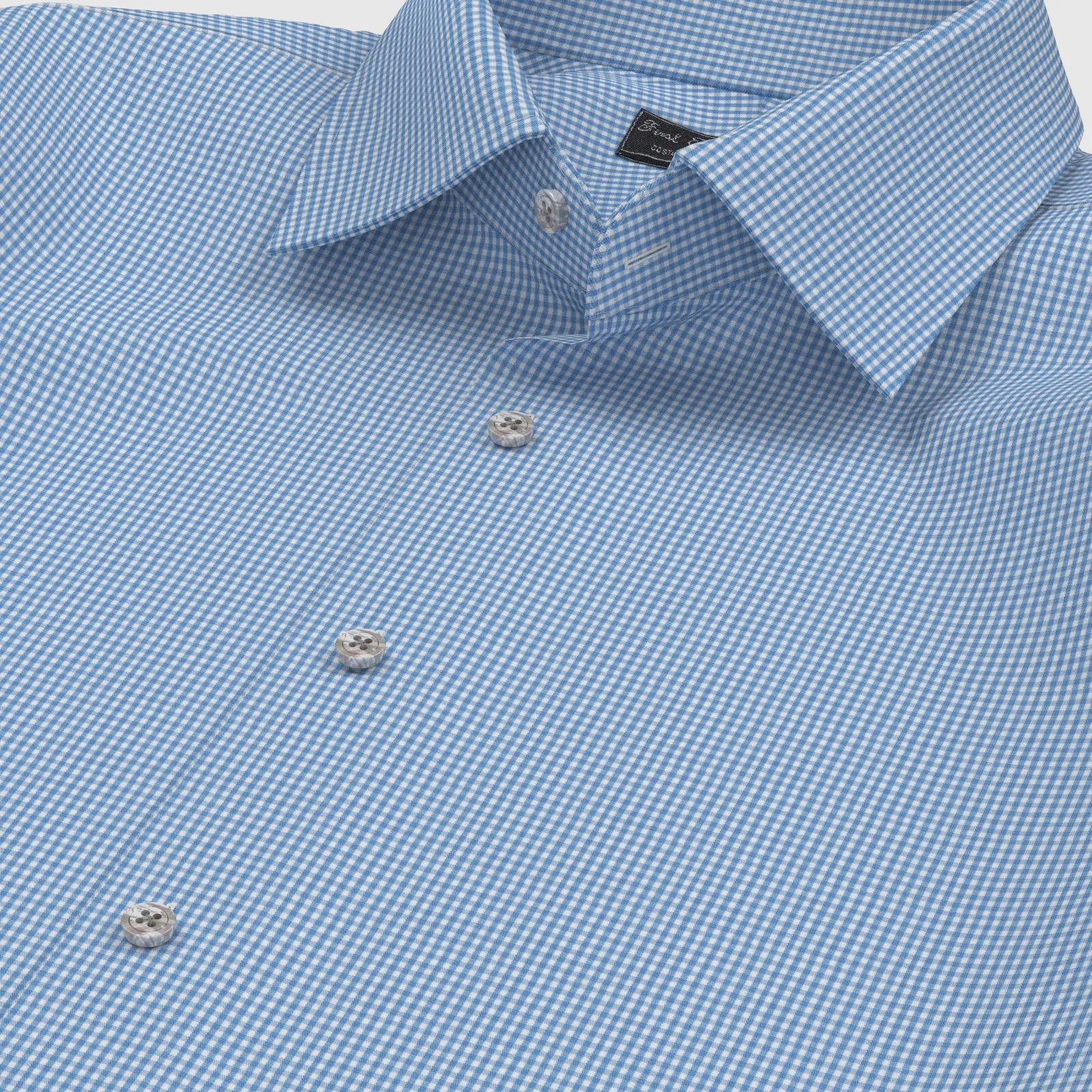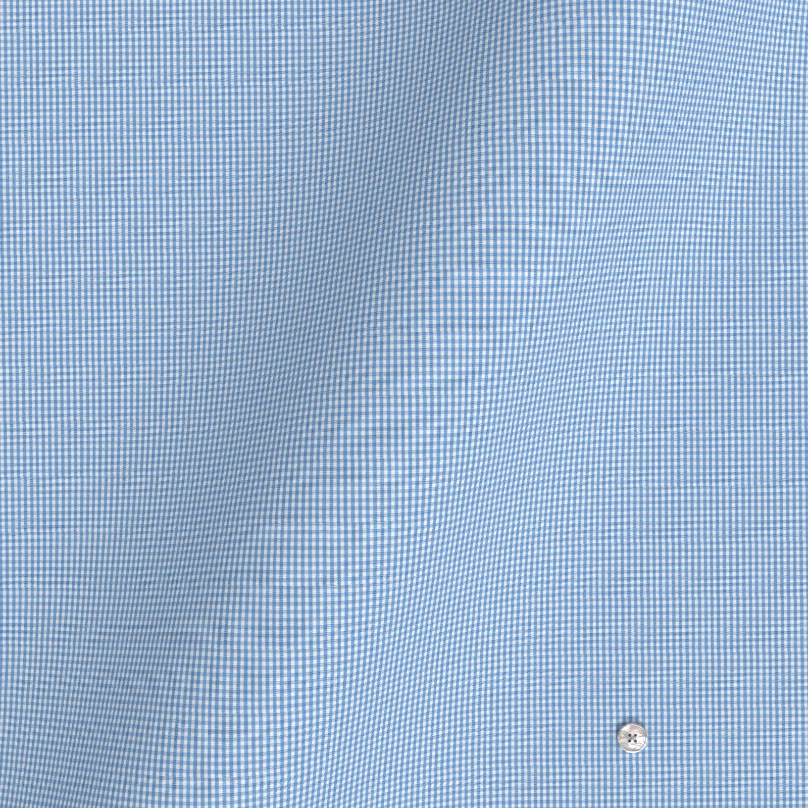 詳細きれいなサックス・チェックの綿100%イージーケア素材です。家庭洗濯+軽いアイロンがけですっきり・きっちりと着こなせる忙しいビジネスマンにぴったりの素材です。肌触りも綿100%の風合いを損なわない着心地です。