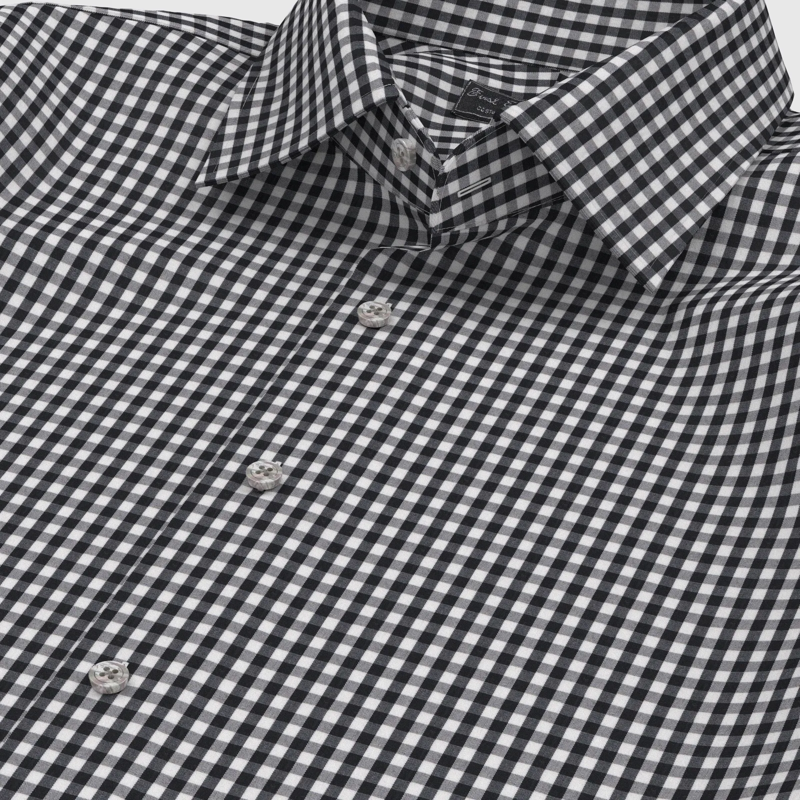 詳細きれいなブラック・ブロックチェックの綿100%イージーケア素材です。家庭洗濯+軽いアイロンがけですっきり・きっちりと着こなせる忙しいビジネスマンにぴったりの素材です。肌触りも綿100%の風合いを損なわない着心地です。