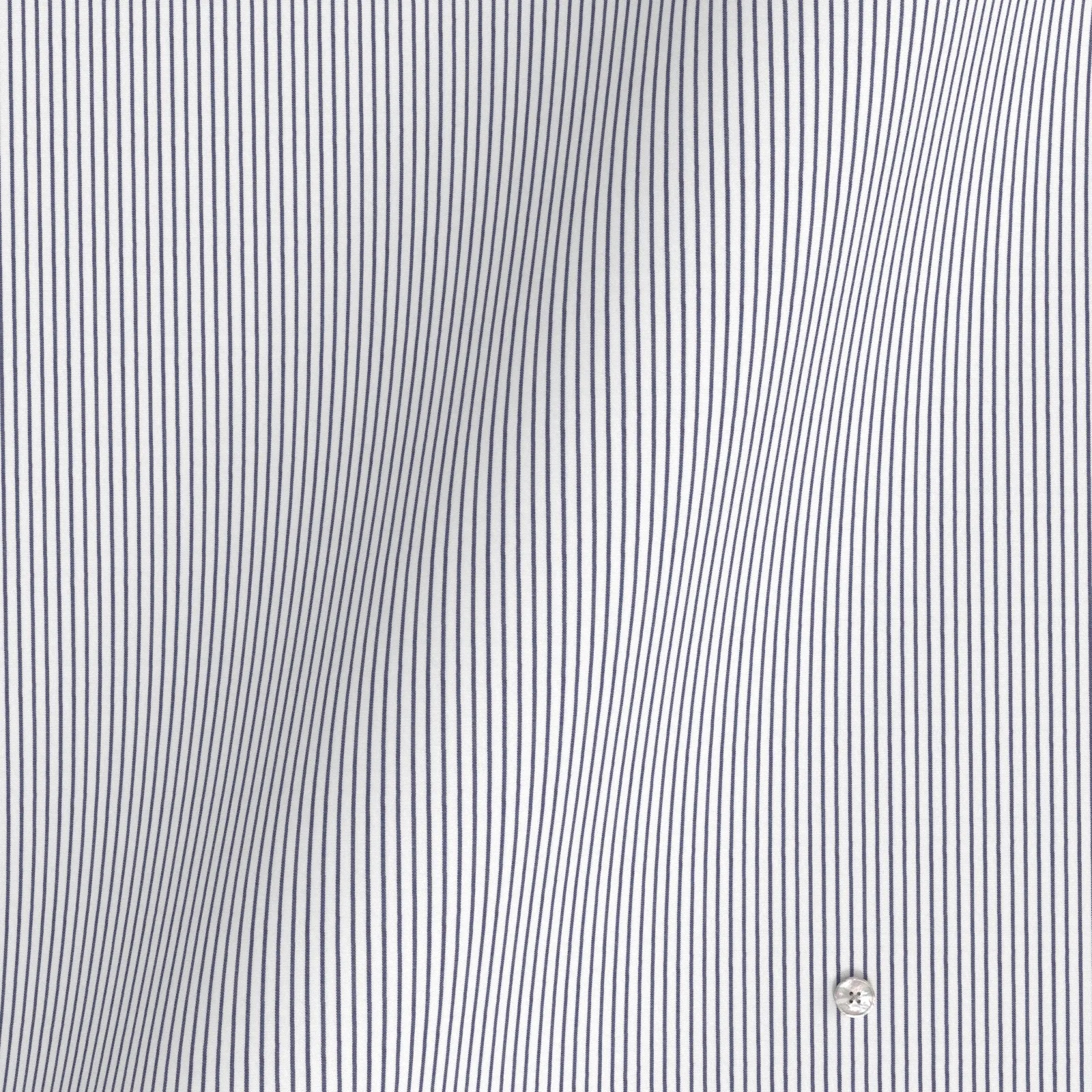 詳細きれいなネイビーの細めストライプの綿100%イージーケア素材です。家庭洗濯+軽いアイロンがけですっきり・きっちりと着こなせる忙しいビジネスマンにぴったりの素材です。肌触りも綿100%の風合いを損なわない着心地です。