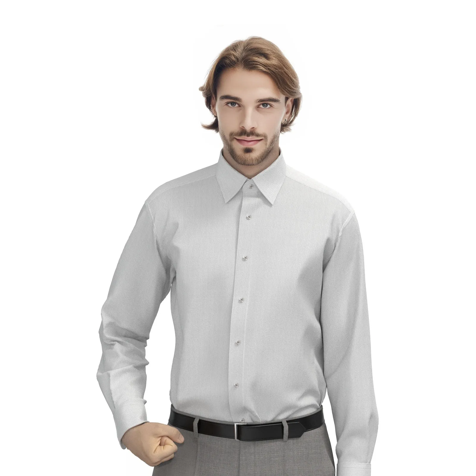 詳細ベーシックでメンテナンスフリーなホワイトのドビー ストライプ生地です。
